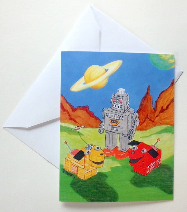 The images on these cards are inspired by 1950's vintage Japanese space toys. This card shows A Smoking Spaceman taking his two Robot Dogs for a walk in a landscape inspired by the Japanese box art for these toys.