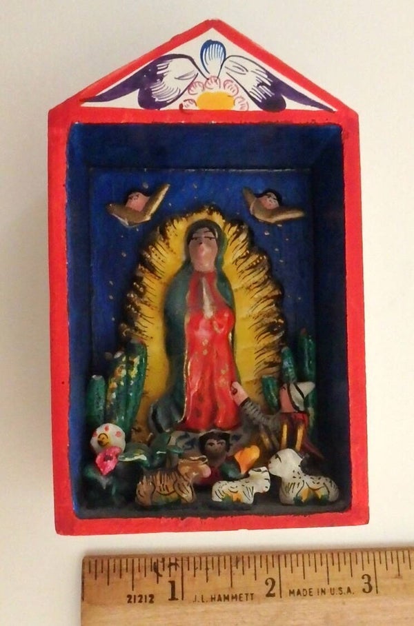 This small open shadow box with hand painted decorations has a "Hand Made in Peru " stamp on the bottom. Three dimensional figures of a saint being worshipped by a figure of a man.