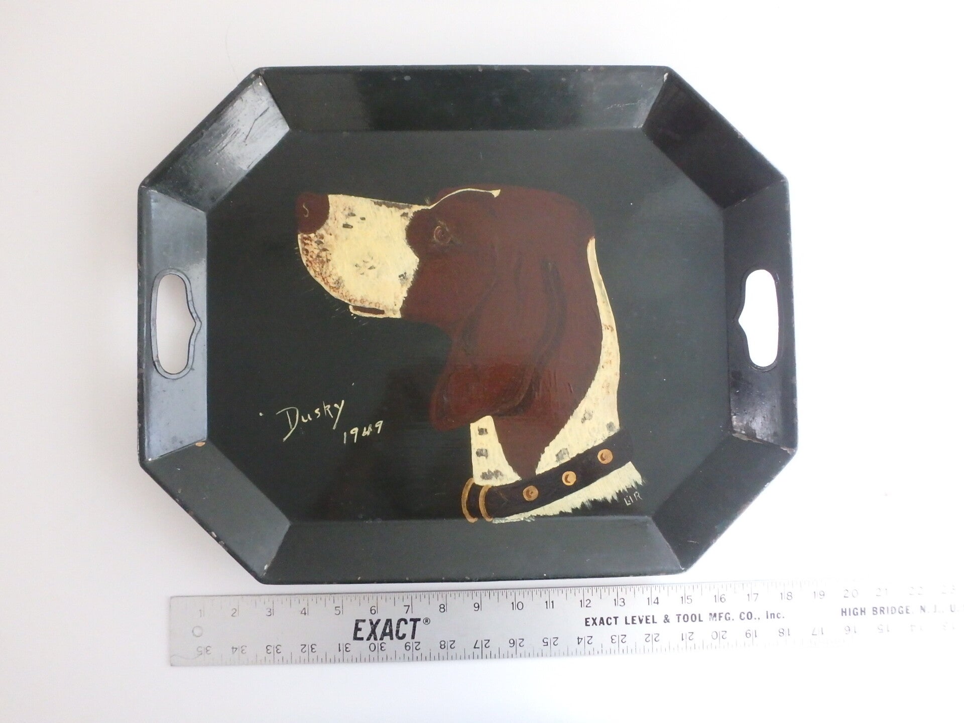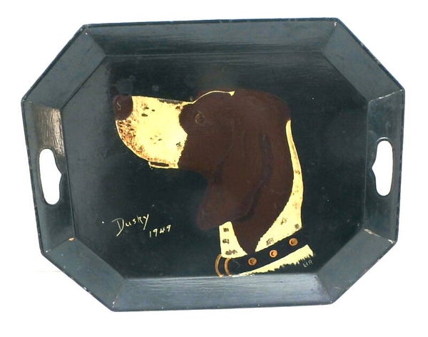 The tray has a wonderful painted portrait of "Dusky" who looks like a German Short Haired Pointer breed, dated 1949. The artist has signed the portrait with their initials LIR.