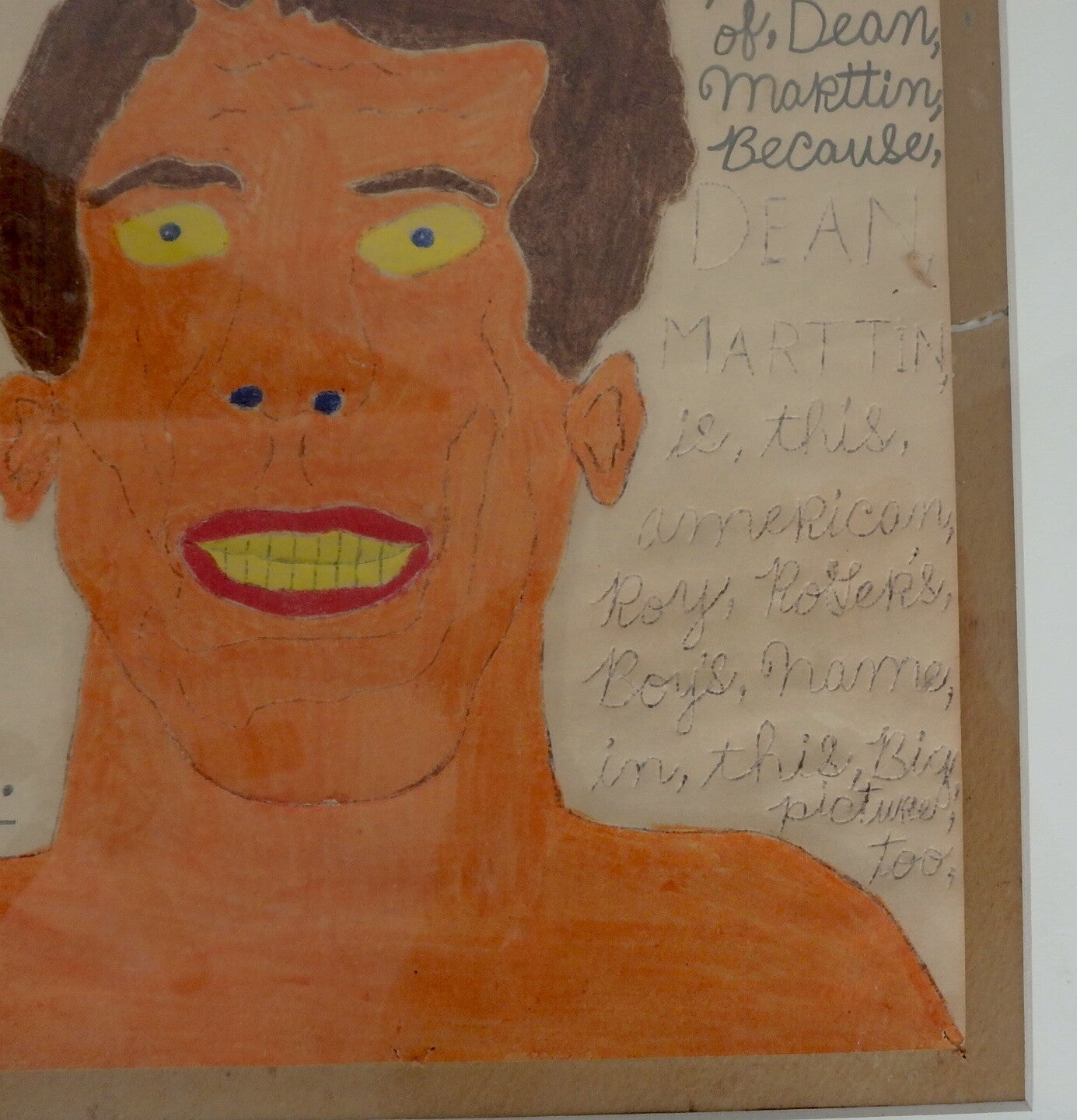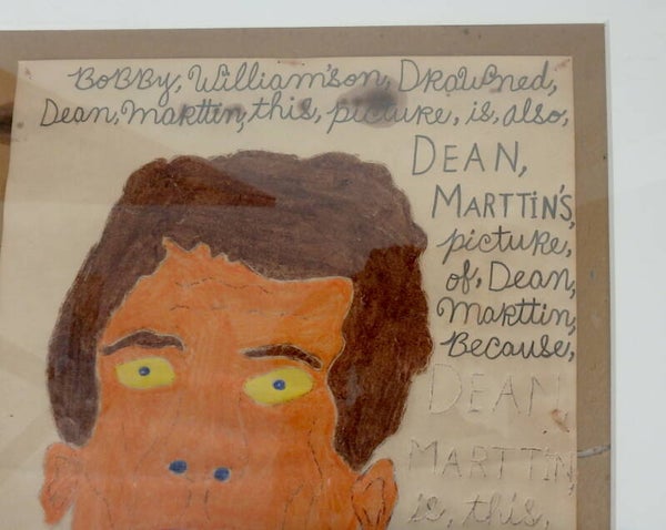 Along with the portrait of Dean, a rambling written message runs across the top and right side of the drawing. It says: Bobby, William'son, Drawned, Dean, Martin, this, picture, is, also DEAN, MARTIN'S, picture, of, Dean, Marttin, Because....and here the writing is fainter but still visible and continues: DEAN, MARTIN, is, this, american, Roy, RoGer's, Boy's, Name, in, this, Big, picture, too.